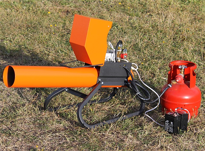 - Экономное потребление газа. Устройство потребляет газ очень экономно — 10 кг пропана хватает на 17 тысяч выстрелов. При интервале 30 минут пушка сможет работать от одного баллона 27 л почти целый год.